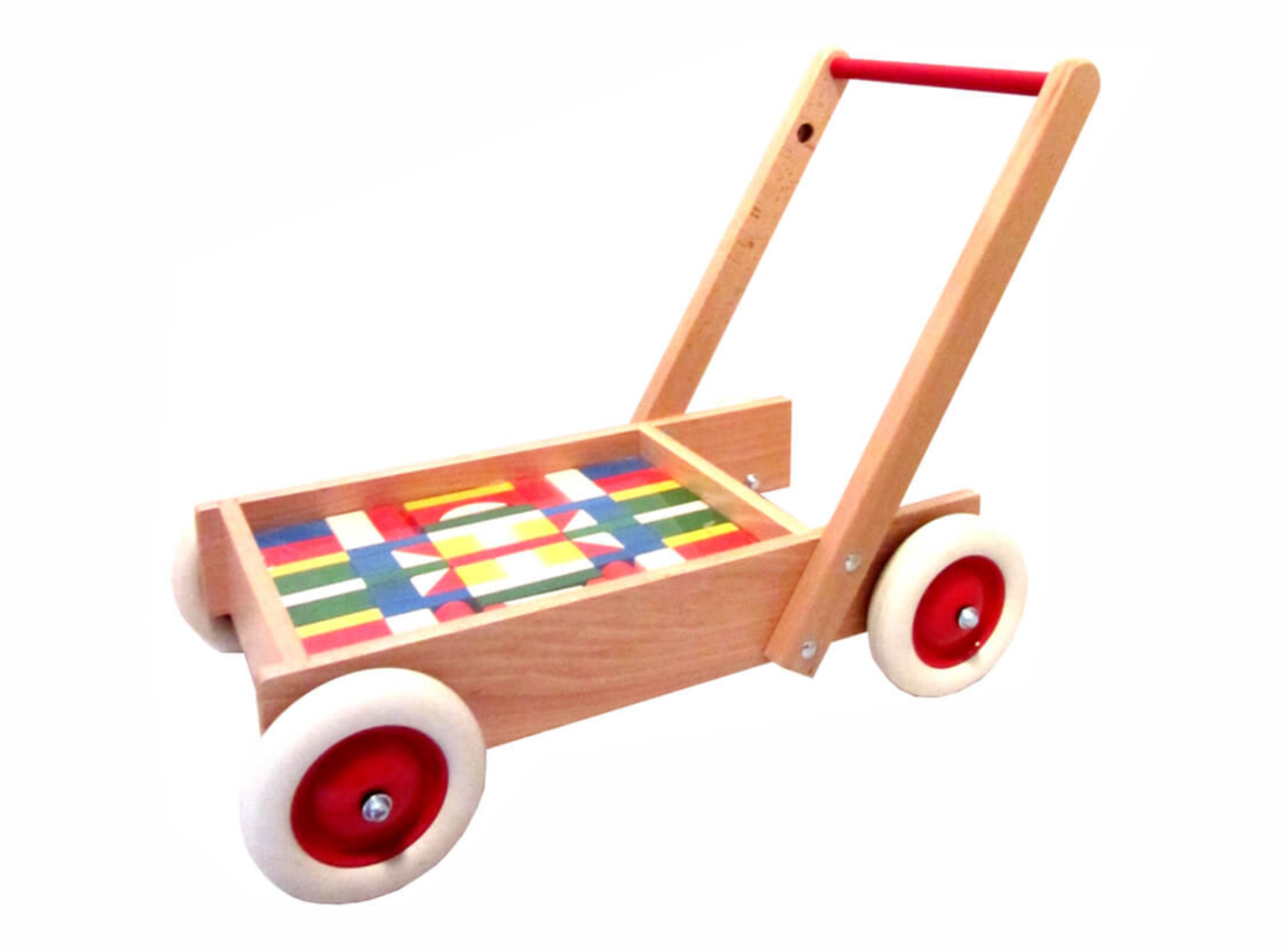 Dieser Lernlaufwagen mit 61 bunten massiven Buchenbausteinen hat einen verstellbarem Griff und vier Kunststoffräder.